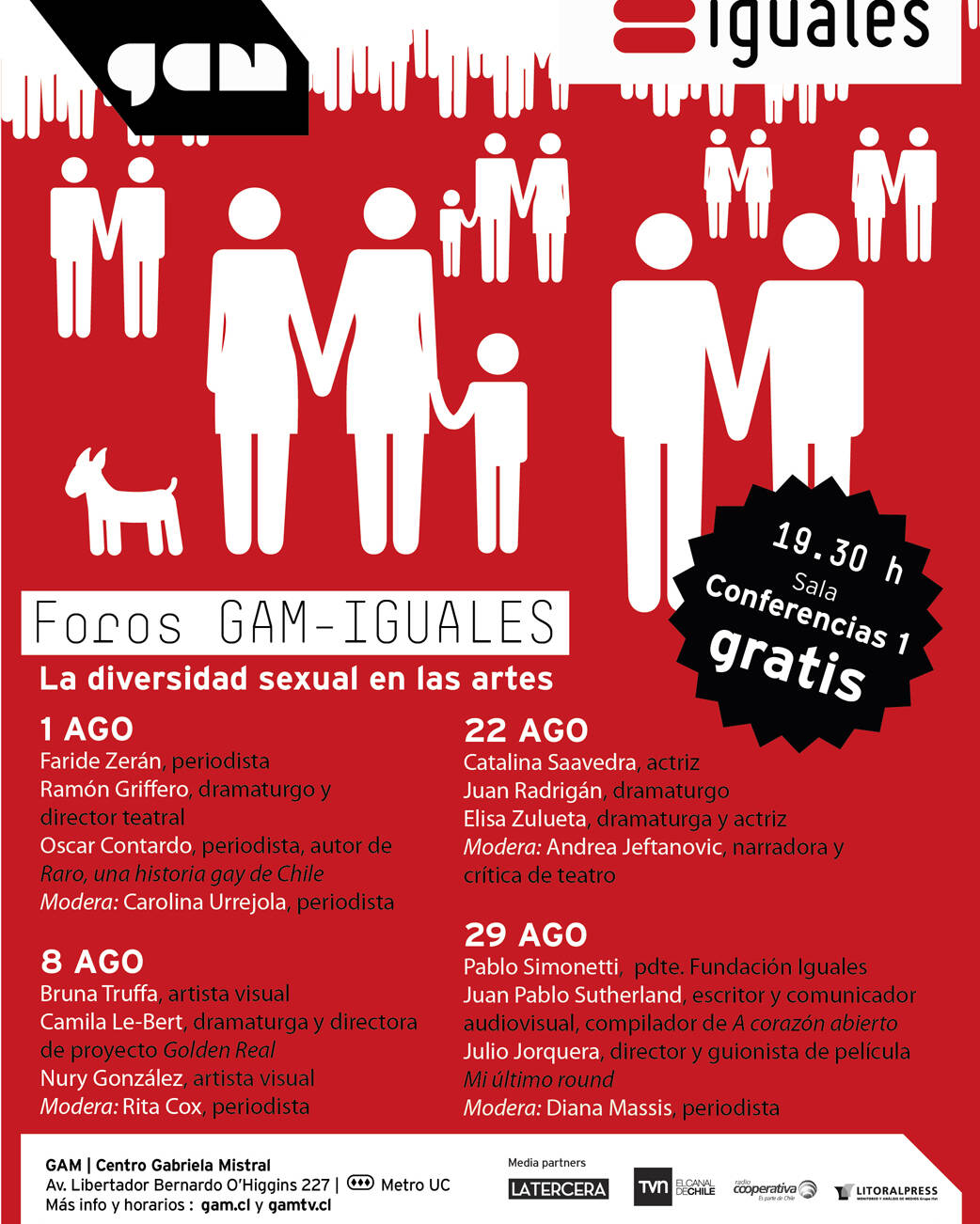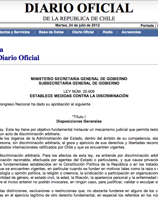 3 agosto, 2012Reflexiones en torno a la parentalidad igualitaria – Por Christian Spuler 1 agosto, 2012Tercer Taller Padres Confundidos 30 julio, 2012Foros GAM – IGUALES: Conversando sobre diversidad en las artes 30 julio, 2012Programa de foros GAM – Iguales 27 julio, 2012Obra basada en la única novela de Oscar Wilde se estrenará en el Teatro Alcalá. 25 julio, 2012UVM impartirá curso sobre Diversidad Sexual 24 julio, 2012A casi dos semanas de su promulgación el Diario Oficial publica la Ley Antidiscriminación 24 julio, 2012Familia de Valeska Salazar presenta hoy querella criminal en Juzgado de Santa Juana